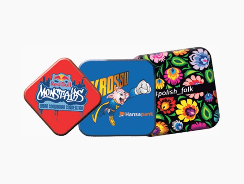 Oferujemy również przypinki okrągłe oraz przypinki kwadratowe, a także przypinki w niestandardowych kształtach: przypinki sześciokątne, przypinki ośmiokątne, przypinki serce, przypinki trójkątne, przypinki gwiazda, przypinki tarcza.